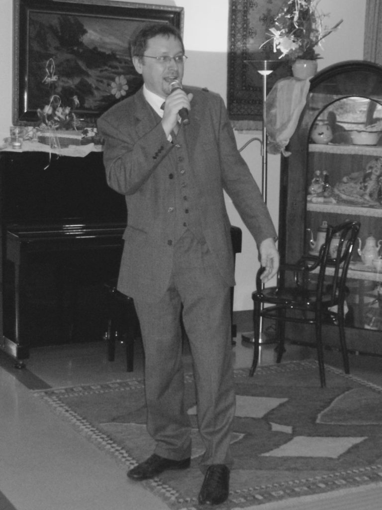Anton Wilflinger kündigt im Haus der Barmherzigkeit die auftretenden Künstlerinnen und Künstler im großen Saal an.